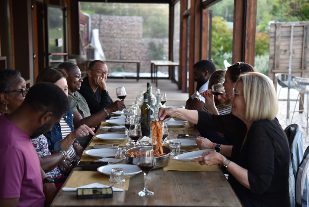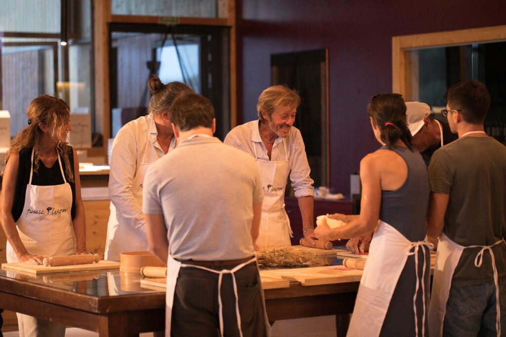 Insieme ad un’altra famiglia abbiamo iniziato a cucinare su piccoli fornelli all’aperto, preparando sughi, pasta e dessert. Mia figlia di nove anni amava ogni minuto, indossava orgogliosamente il suo grembiule e aiutava con l’impasto. Mentre la salsa cuoceva dolcemente abbiamo gustato vino locale e piccoli bocconi, circondati da risate e racconti.