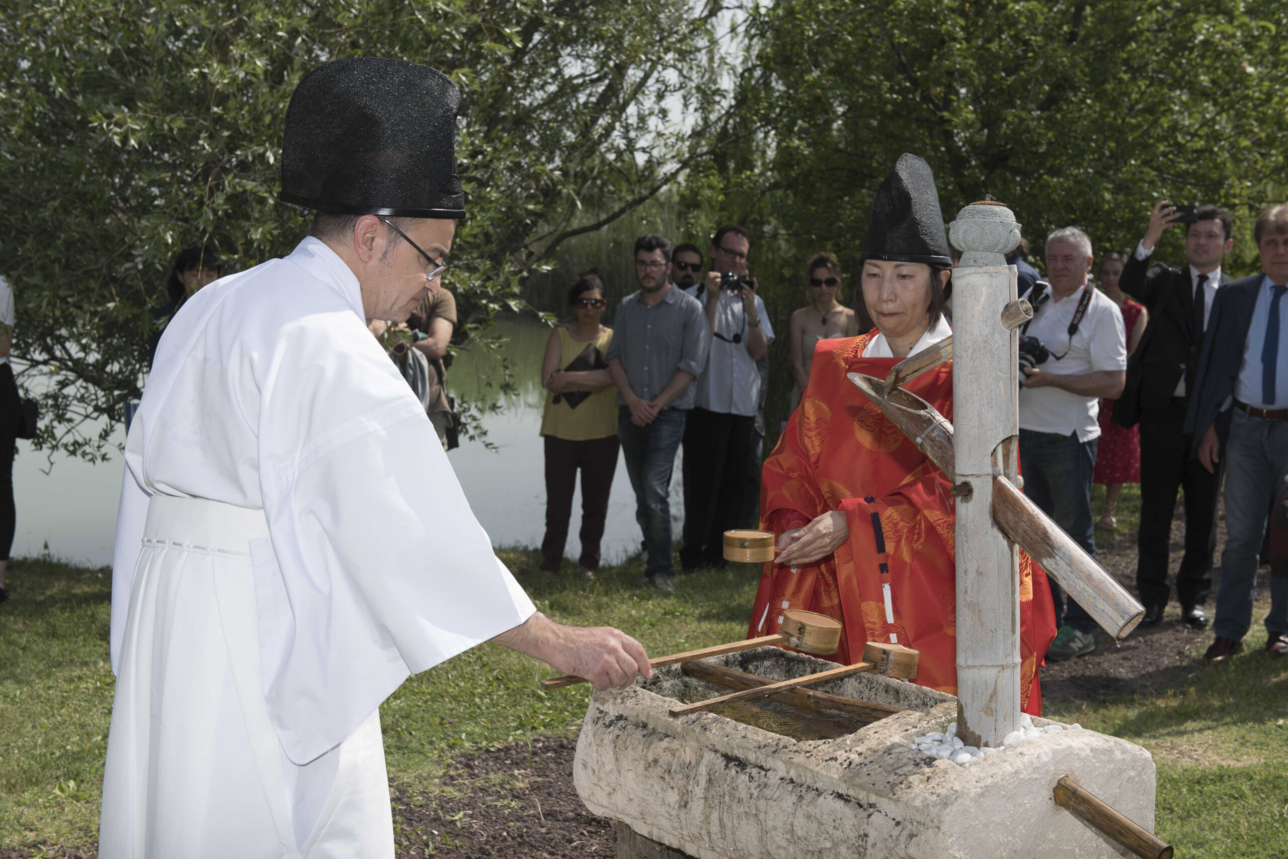 Con il mestolo si raccoglie l’acqua per bagnarsi le mani e la bocca, poi lo si poggia nuovamente sul bordo della vasca, dove la canna di bambù riversa l’acqua, pronta per il prossimo visitatore.